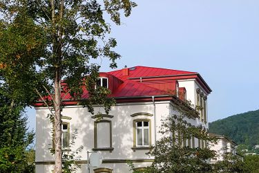 Blechdacheindeckung mit farbigen Aluminumbändern in Stehfalztechnik. Verkleidung der Gesimskästen sowie der Gauben mit Aluminumblech. Dachentwässerung sowie Fensterbänke und Gewände aus Titanzink.
