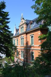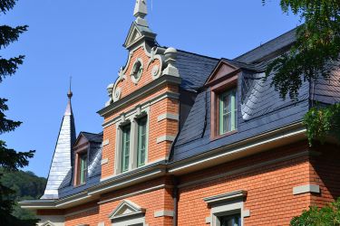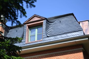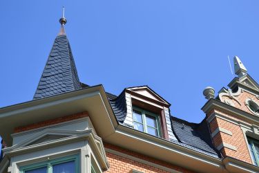 Dacheindeckung mit Naturschiefer an Mansarde und Hauptdach. Spenglerarbeiten aus Kupfer an Gauben und Gesimsen sowie der Dachentwässerung.