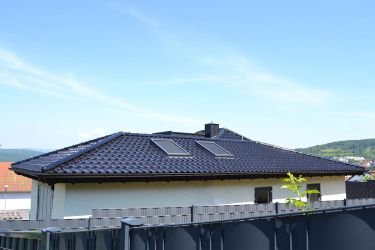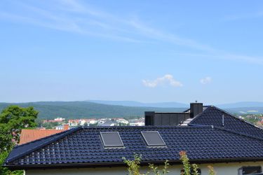 Ziegeleindeckung mit glänzenden, edelengobierten Ziegeln. Einbau neuer Dachfenster sowie förderfähiger Aufdachdämmung. Spenglerarbeiten mit schwarzen Aluminiumbechen und farblich beschichteter Dachentwässerung.