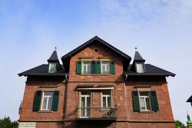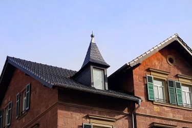 Dacheindeckung mit traditionellen Doppelmuldenfalzziegel in edelschwarz. Verkleidung der Ortgänge, Kamine und Gauben mit anthraziten Aluminiumblech. Dachentwässerung aus Titanzink. Dacheindeckung der straßenseitigen Gauben mit Naturschiefer inkl. neuer Titanzinkspitzen.