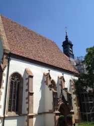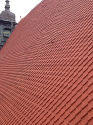 Neueindeckung der Kirche gemischt mit alten und neuen gotischen Biberschwanzziegeln.
